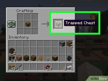 El cofre es un bloque de almacenamiento simple que puedes hacer con ocho tablones en una mesa de trabajo. El gancho de alambre trampa es un objeto que puedes hacer con un palo, un lingote de hierro y un tablón. No se necesita una mesa de trabajo para hacer un cofre con trampa, ya que la cuadrícula de trabajo 2×2 de tu inventario también es viable.