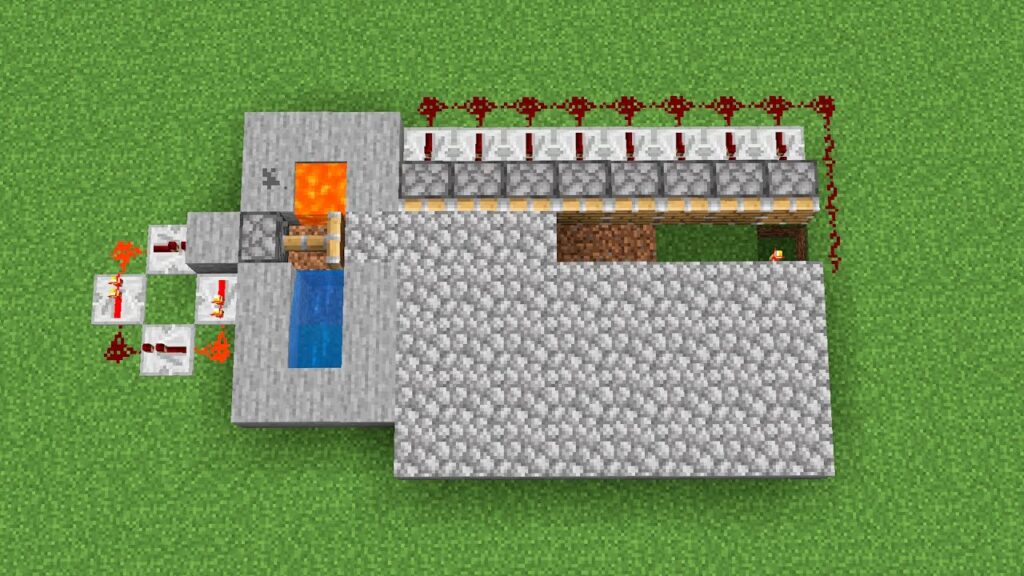 - Antes de añadir la lava al anillo que hemos creado, deberíamos tener una forma de desactivar el generador. Puedes hacerlo de forma sencilla si colocas una palanca unida a la línea de piedra roja antes del repetidor. De esta forma, los pistones pegajosos se activarán y detendrán la granja. Y si desactivas la palanca, los pistones pegajosos se activarán de nuevo, activando al observador y poniendo en marcha el generador. Por último, añade lava y este generador de adoquines de Minecraft funcionará.